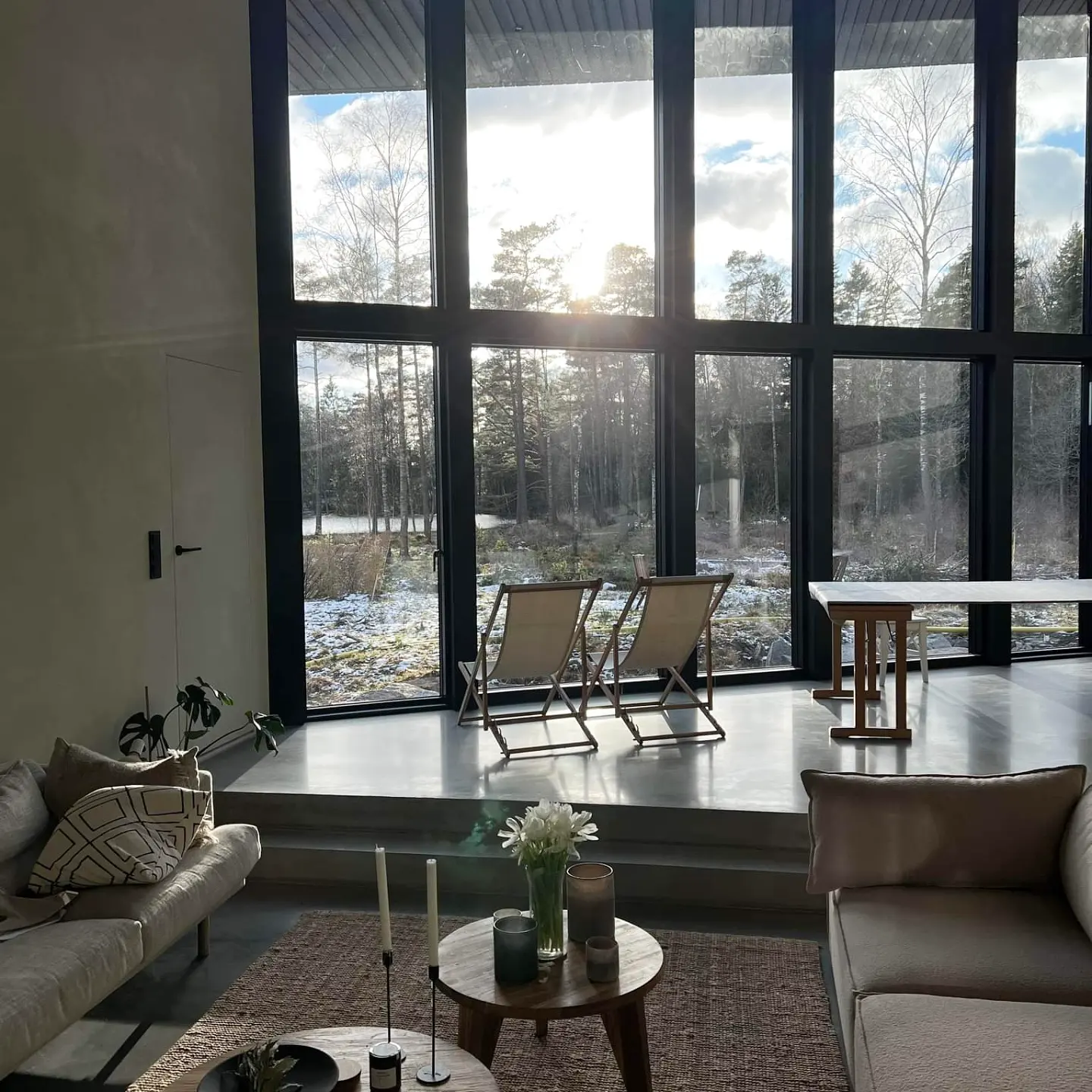 I vardagsrummet är golvet utformat med ett nedsänkt loungeparti i betongplattan. Detta val av utformning bidrar till estetiskt behaglig plats för avkoppling och social samvaro med familjen.
